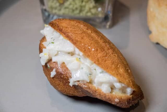 小笠原の塩を使って焼き上げたマドレーヌはホタテ貝の形。開いた口からはホタテのタルタルがあふれていて、ボリュームも十分。