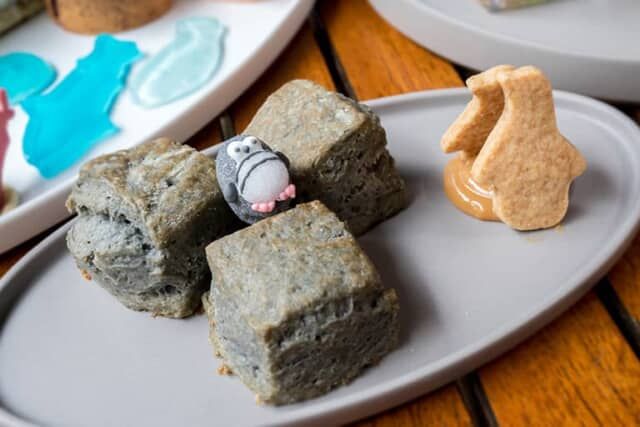 マゼランペンギンが住むアルゼンチンで親しまれているキャラメルのようなジャム “ドルセ・デ・レチェ” をペンギンクッキーの間にサンド。ゴツゴツした岩場は竹炭で色をつけたスコーンで、甘味さ控えめ、食べ応えもありました。