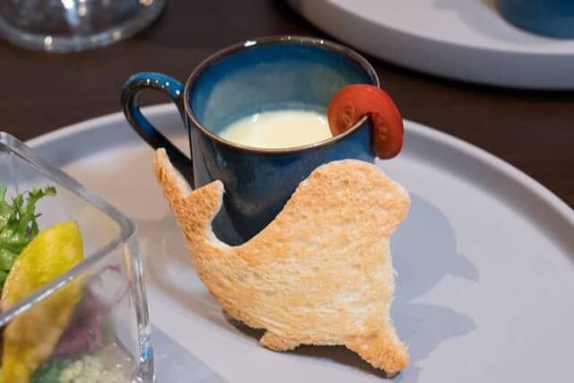 ガスパチョと言えばトマトを使った赤ですが、こちらは黄色いパプリカでできた鮮やかな色あい。ネギの風味がきわだっていて、スパイシーなタバスコ使いも印象的。スイーツの合間のお口直しにピッタリです。オットセイの形をしたクッキーも、軽やかな歯応えでした。