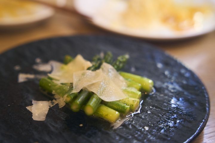 磯の香りを感じながら、海苔バターで炒めたアスパラガスをひと口(880円)。