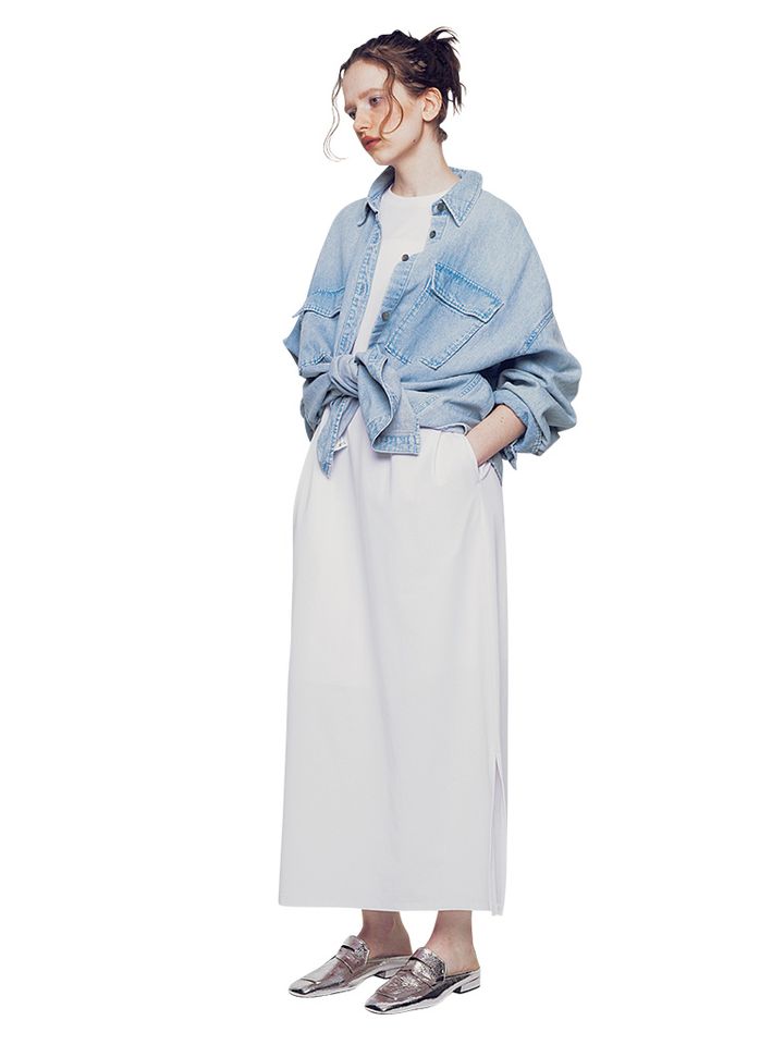 【POINT】さらっとした白ワンピースに表情をつけるように、オーバーサイズのシャツをON。すそを結んだり、そでをまくったりのアレンジが、のっぺり感を解消。暑くるしく見えないよう、色は薄めに。