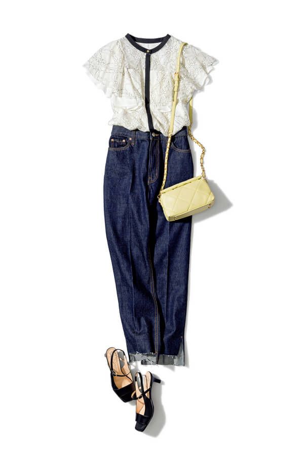 レースブラウス¥13,200/Noëla デニムパンツ¥9,460/Mila Owen バッグ¥14,300/ダイアナ(ダイアナ 銀座本店) サンダル¥17,600/銀座ワシントン(銀座ワシントン銀座本店)