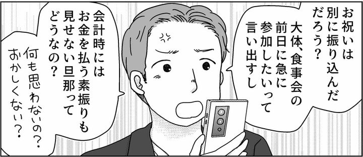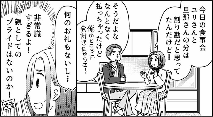 食事会の会計時に前妻夫妻が自分たちの食事代を支払う素振りがなかったのも引っかかり、私は不満が募ります。