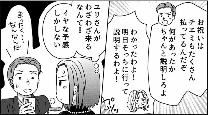 夫が前妻に電話します。「今回のお祝いは、チエミも出してくれたんだぞ。何があったかちゃんと説明しろよ」