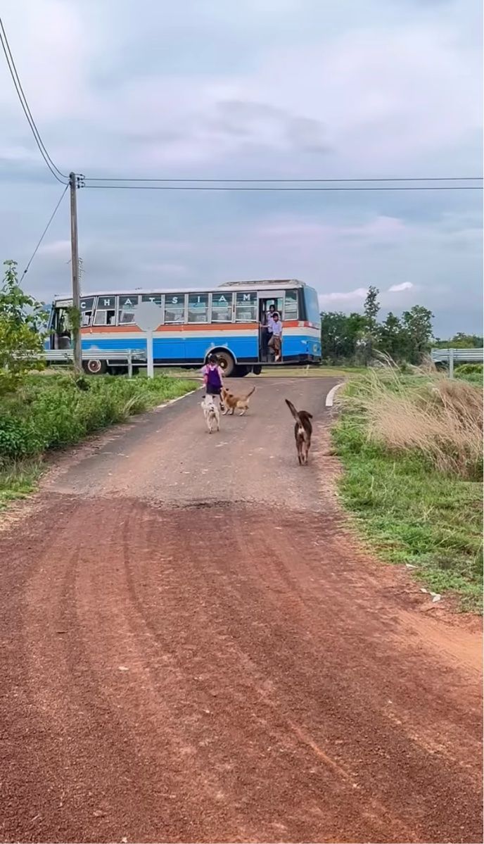スクールバスの到着を待ちわびていたイヌたち。 女の子がバスから降りてくると、嬉しさを全身で表しながら一目散に向かっていくのでした。