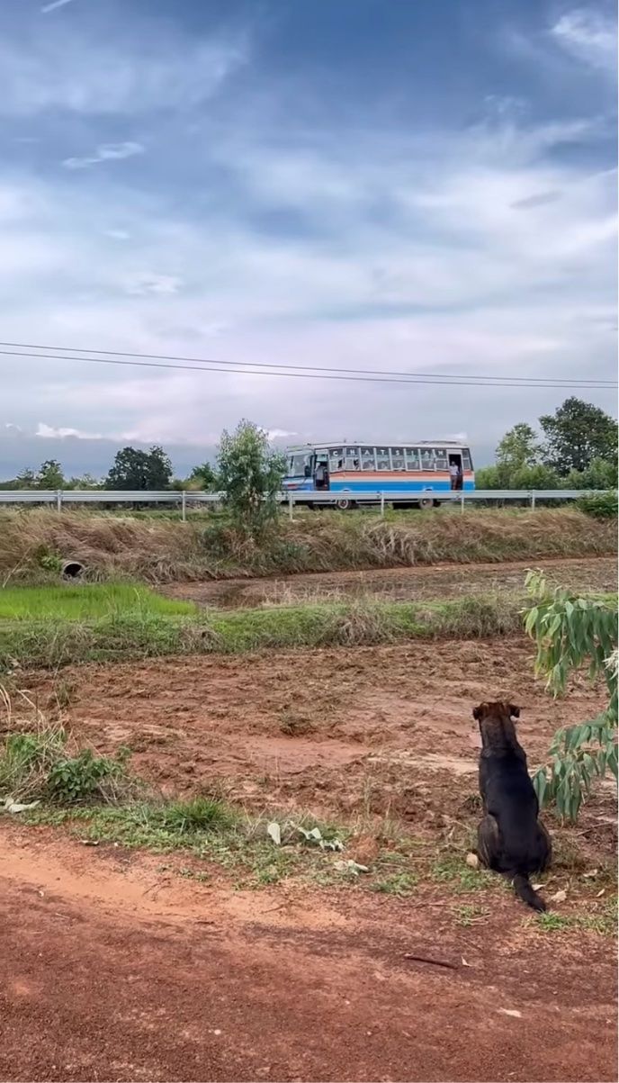 スクールバスをじっと見つめるイヌ。 この子は、大好きな家族の帰りを今か今かと待ちわびていました。