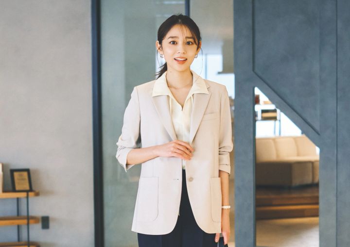 営業でNGなのは「ゆるい」格好と同時に「子ども」っぽく見えてしまうこと。仕事を任せてもらうためには、この人なら大丈夫という信頼感が何より大切。ベーシックなジャケットやきれいめパンツ、控えめカラーの小物に加え、メイクやしぐさも落ち着いた印象を与えるよう心がけます。