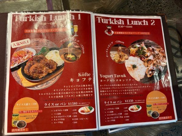 「キョフテ」と「ヨーグルトチキンソテー」はパンかライスが選べます。写真に写っているライスの中の少し茶色い物体はパスタだそうです。ライスの中にパスタ、どんな食感なのかとっても食べてみたいです! テイクアウトも出来るようです。