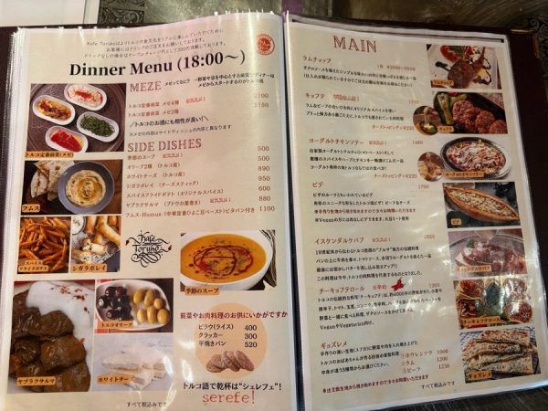 夜のメニューはトルコ産のお酒やワインにあうおつまみがたくさんあります。 メニュー表にある「メゼ」とは、トルコでは前菜のようなものです。 聞き慣れない名前の食べ物が沢山ありますが、「フムス」とは中東や地中海地方では伝統的な食べ物でヒヨコ豆を茹でてペースト状にした食べ物です。ニンニクやオリーブオイルなどで味付けられています。それをクラッカーに付けて食べます。