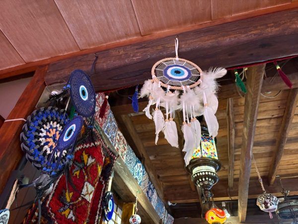 ゆーったりとしたトルコの音楽が流れています♪ トルコ絨毯が敷き詰められていて、トルコの魔除けで目玉のような形の「ナザールボンジュウ」が沢山飾られています。