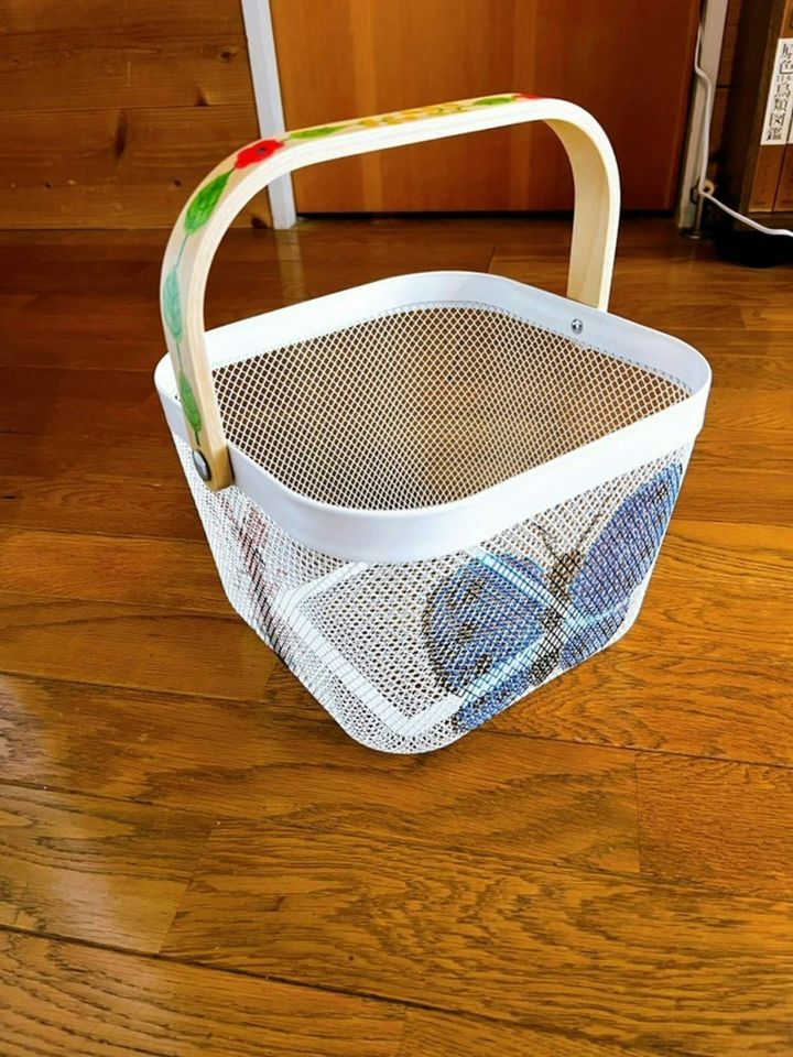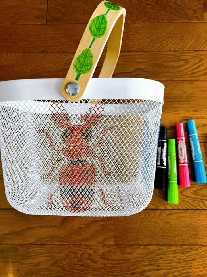 白い網目状のバスケットに描かれたのはカラフルな虫や蝶。持ち手には葉っぱが描かれて、まさに「好き」があふれたバスケットですよね。夏休みの宿題を入れるために作ったそうですが、捨てる予定だったバスケットがこんなに素敵に変身するとは驚きです。