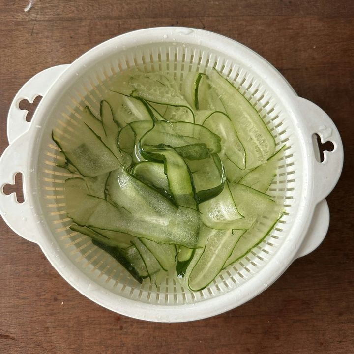 ②きゅうりはピーラーで縦に削ぎ冷水へ