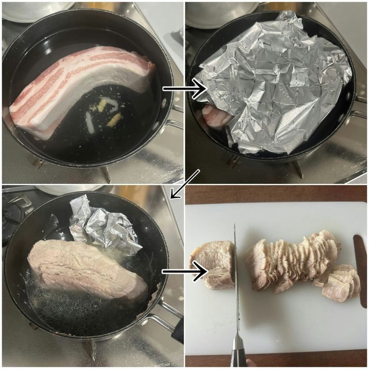 ①鍋に豚バラ塊300gと被るくらいの水、酒大3程度を入れ弱火で40分程煮、ゆで汁に漬けたまま冷ます