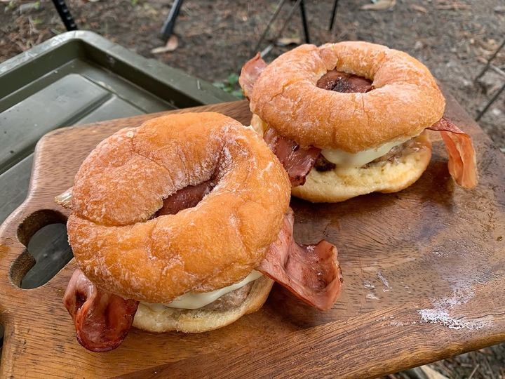 こちらは、@ironworks.tknさんがキャンプの朝食用に作った「ドーナツベーコンチーズバーガー」。同じく甘じょっぱい食べ物の「みたらし団子の豚バラ肉巻き」は好みではなかったそうですが、「これはあり!」と太鼓判。