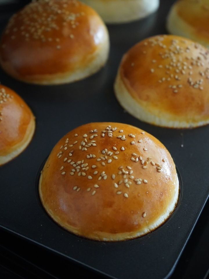ホームベーカリーを使って生地を作ったら(手ごねで作っても!)、一次発酵、ベンチタイムと進み、イングリッシュマフィン用の型に入れます。二次発酵が終わったら、溶き卵を塗ってごまを散らしておめかし。200℃のオーブンで12分焼けば、こんなにツヤツヤでおいしそうなバンズが出来上がるんです!
