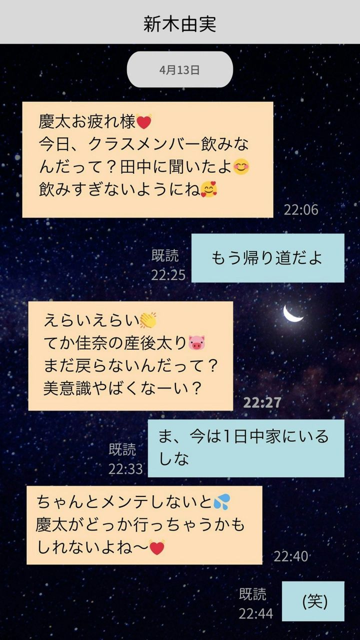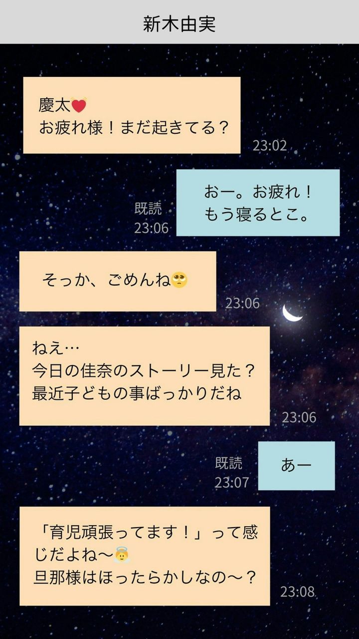 佳奈:私の悪口言ってたね。「育児ばっかり」「美意識ヤバい」「要領悪い」。由実も慶太もひどい。笑って話してたんでしょ?