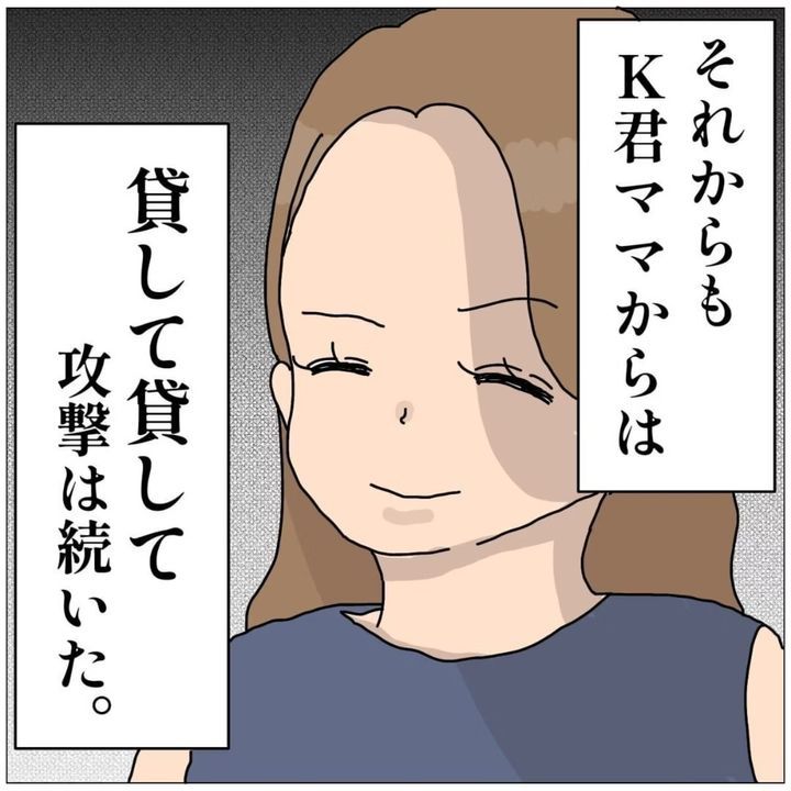幼稚園のお迎えのあと、主人公が他の子どもやママ友たちと公園でサッカーをして遊んでいると「うちの子にも貸してください」と同級生・Kくんのママがやってきました。快く仲間に入れたものの、仲良くなるにつれてKくんママは本性をあらわに。貸した物を乱暴に扱うKくんと、それを注意しないKくんママに主人公はモヤモヤしていました。Kくんママの「貸して」は次第にエスカレートしていき、他のママたちも警戒する存在に。そしてクリスマスがきて、主人公の息子は自転車をもらったことをKくんに話しますが…。もっち・怖い女たちの体験談・漫画(@mocchi_kakei)さんによる作品『貸して貸してママ友』第14話をごらんください。