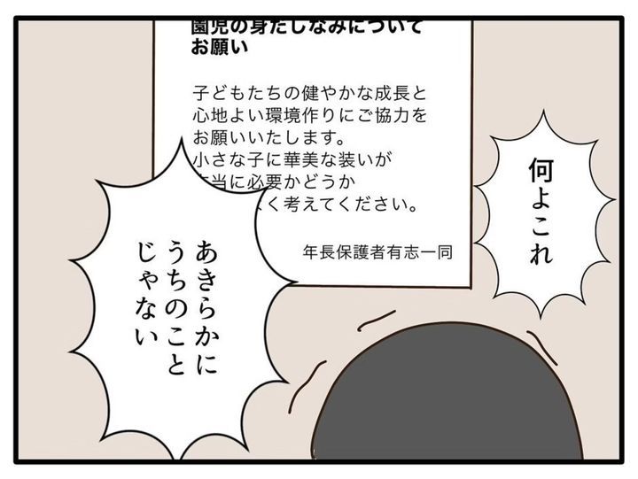 保育園の掲示板に貼られた「身だしなみのお願い」。その内容がゆうこの金髪を指していることは明らかでした。他の保護者たちからの間接的な非難に戸惑い、えみこは複雑な思いに包まれます。