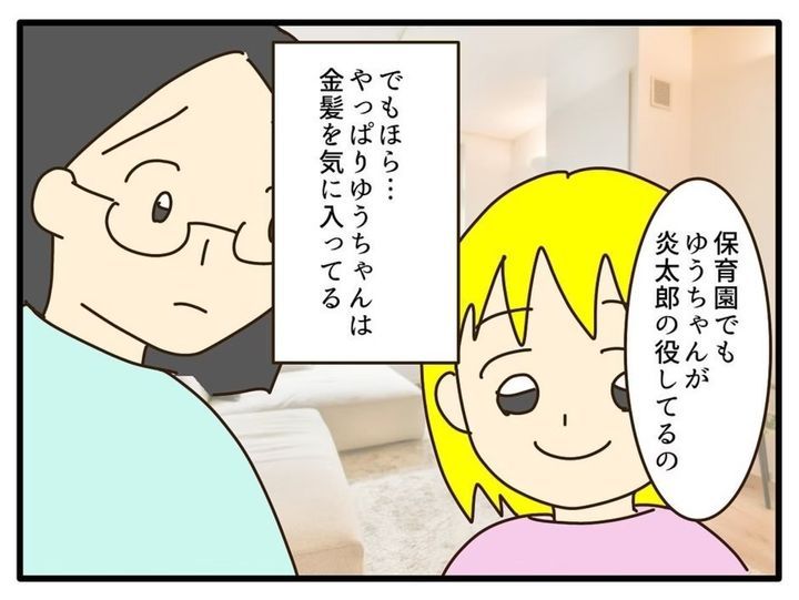 娘は父に保育園の友達についてうれしそうに話し、好きなアニメ「炎太郎」のキャラクターと友達の性格を重ね合わせて楽しそうに語りました。