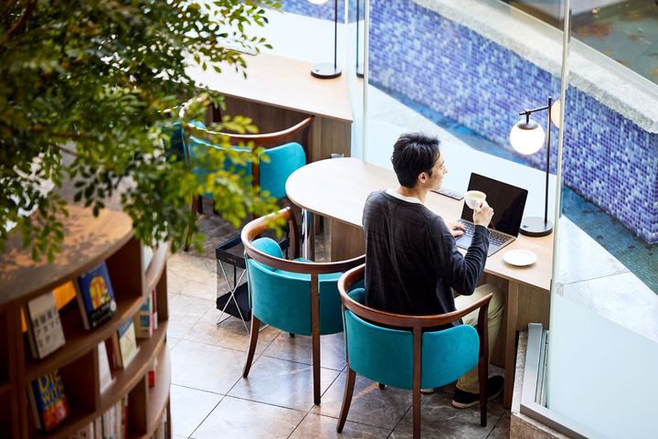 大きな窓から差し込む柔らかな自然光に、ゆったりと優しく包み込まれるラウンジ空間。温かみのあるインテリアとスタイリッシュなデザインが、ほっと落ち着いたひと時を演出している。ここの魅力はなんといっても、迷路のように立ち並ぶブックシェルフ。日本語・英語・中国語の3言語で展開された25,000冊のコミックや書籍は、ワクワク感と知的好奇心を高めてくれるだろう。