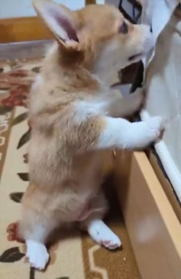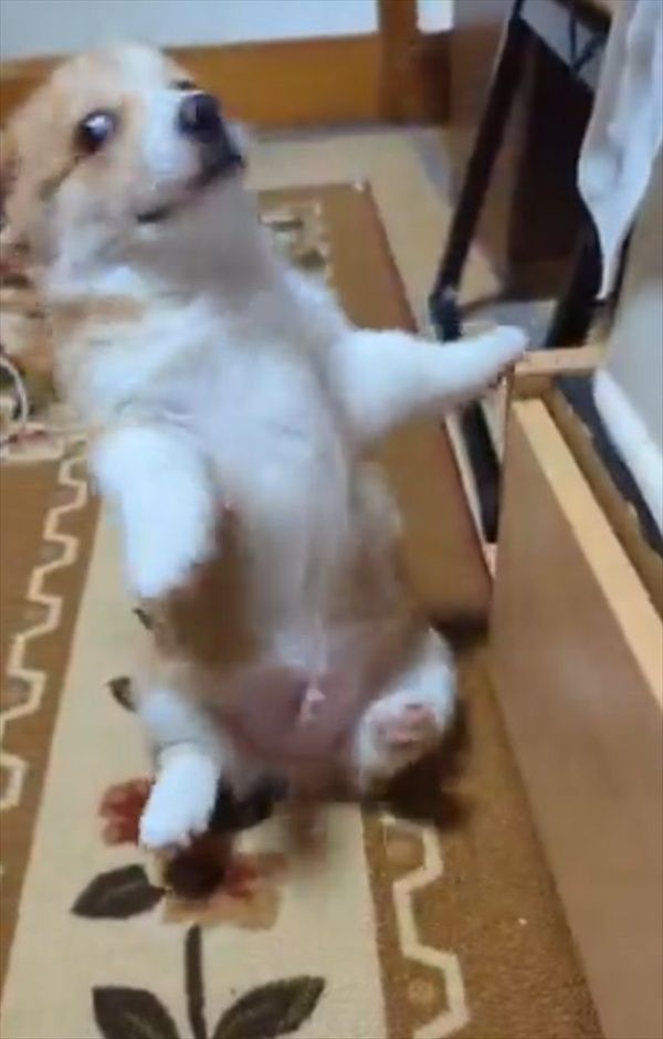 つかまり立ちをして二足歩行をしていたコーギー。 ところが、ふとした拍子にコテンと倒れてしまいましたが・・・、その直後のリアクションまで撮影した動画が話題となっています。