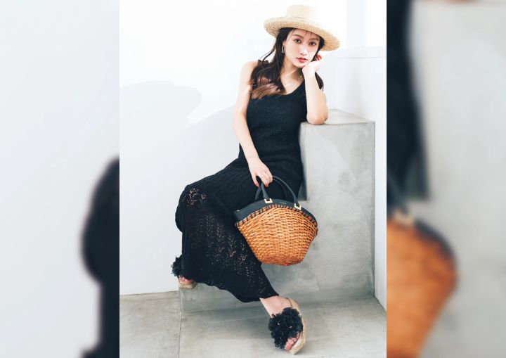 サンダル[H4]¥11,880/RANDA ワンピース¥23,100/FRAY I.D ルミネ新宿2店 ハット¥39,600/アース(OVERRIDE 神宮前) ピアス¥50,600/フェルセラ(ズットホリック) バッグ¥30,800/ヴィオラドーロ(ピーチ)