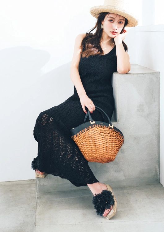 ボリューム感のあるフラワーモチーフがシンプルコーデのポイントに。隙間からさりげなくきらめくビジュー、ジュートウェッジもシーズンムードたっぷり。