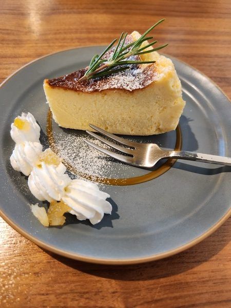 可愛いお皿にのったケーキと、キャラメルソースと生クリームに粉糖…丁寧に作られているのが感じられます!