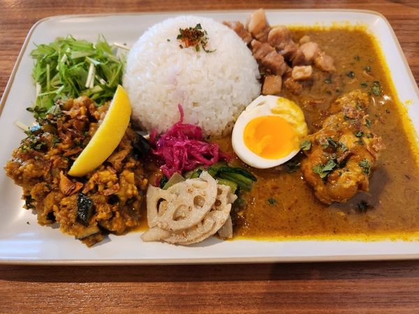 この日私が注文したのは、スパイスチキンカレーと月替わりカレーの2種あいがけ1,200円。