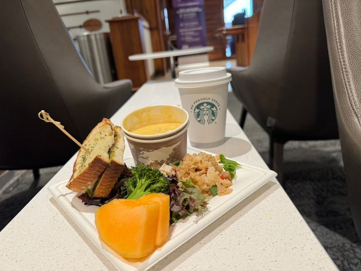 ラウンジ内では、軽食やドリンク、Wi-Fi、充電設備などが提供されています。快適なソファ席でリラックスしながら、搭乗前の時間に日本とのやりとりなど一仕事終えました。