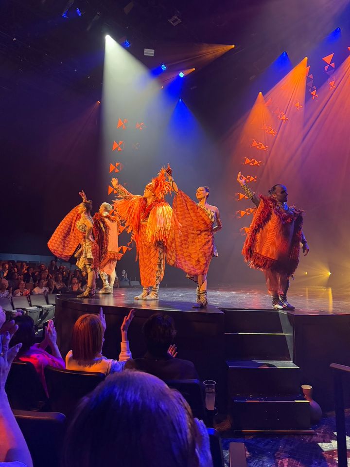 月の女神ヒナを象徴するエアリアルフープの演技や、フラダンス、スリリングなアクロバットなどが織り交ぜられ、目と鼻差の先の真横の階段にふと演者が表れたりとすごい臨場感。