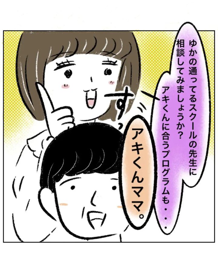 そんなまるさんの気持ちなど知る由もないゆかちゃんママは、さらに「ゆかの通ってるスクールの先生に相談してみましょうか?アキくんに合うプログラムも・・」とおせっかい発言。するとそこへ「アキくんママ」とゆかちゃんママの話を遮るようにすっと児童館の先生が2人の間に入って来ました。