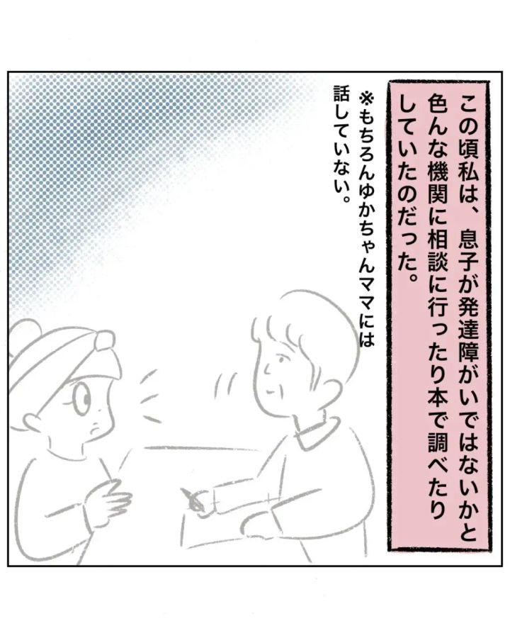 アキくんがお昼寝をしないと言っただけで「それ発達障がいの特徴ですよ?」「発達障がいの子がお昼寝しないのはあるあるなんですよ!」「ショートスリーパーと発達障がいの睡眠障害は全然違いますよ!」とまるさんにズケズケと言ってきたゆかちゃんママ。息子のアキくんが発達障がいなのではないかとまるさんが不安に感じていたときにそんなことを言われ、まるさんは「やっぱりそうなの?」という不安な気持ちと「なんだこいつ?」という怒りの気持ちで感情がぐちゃぐちゃになります。