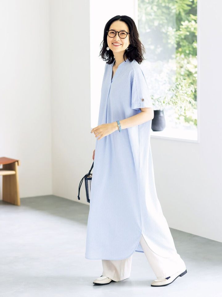 襟元のほどよい開きとストライプ柄がすっきりとした印象のワンピース。柔らかな綿混素材でほんのりハリがあり、風をはらんで涼やかです。「見た目も着心地も爽やかで好感度が上がりそう!」(浜島さん)