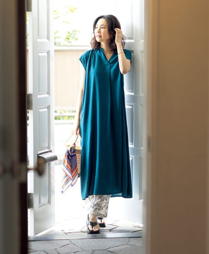 シンプルでカラーが映えるワンピースは花柄パンツを挿して装いを格上げ