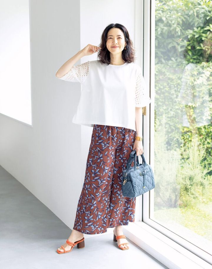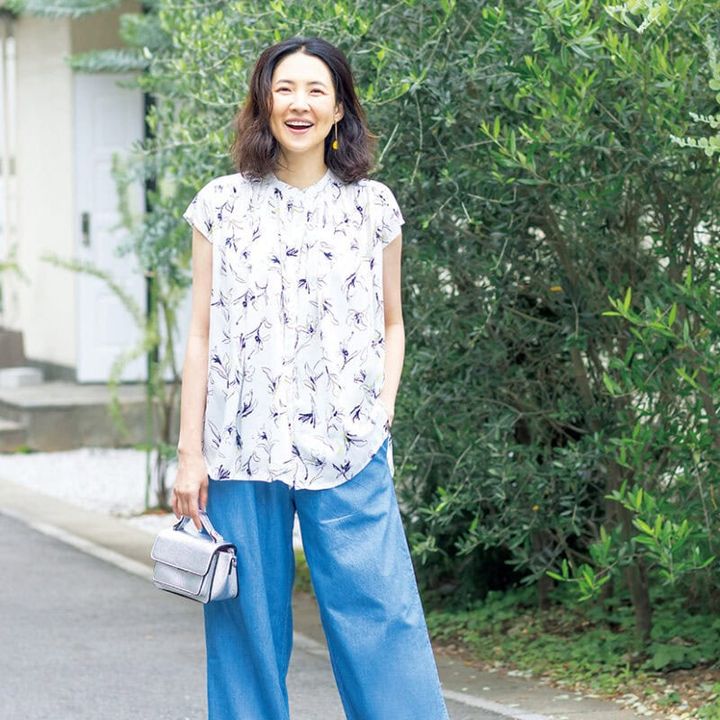 肩に寄せたギャザーと花柄が可愛らしいブラウスは落ち感のいいレーヨン素材で接触冷感機能付き。ワイドパンツはライトオンスのコットンデニム生地を用い、夏でも軽く涼やか。