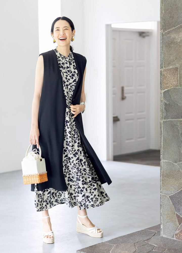 総柄ワンピースは黒のジレで締め、細見え&高見えを叶える