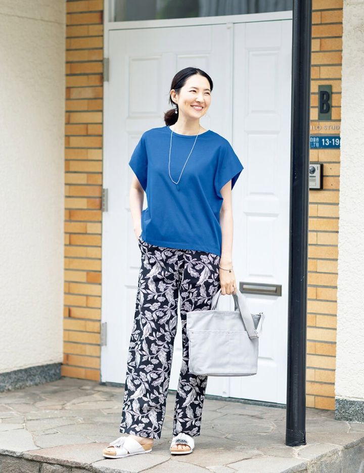 Tシャツは絶妙な袖丈で、二の腕のカバー力があり、ラフすぎずモードな雰囲気。モノトーン柄を挿してキレイ色を引き立てて。「夏の空のような青で気持ちが上がりそう」(浜島さん)