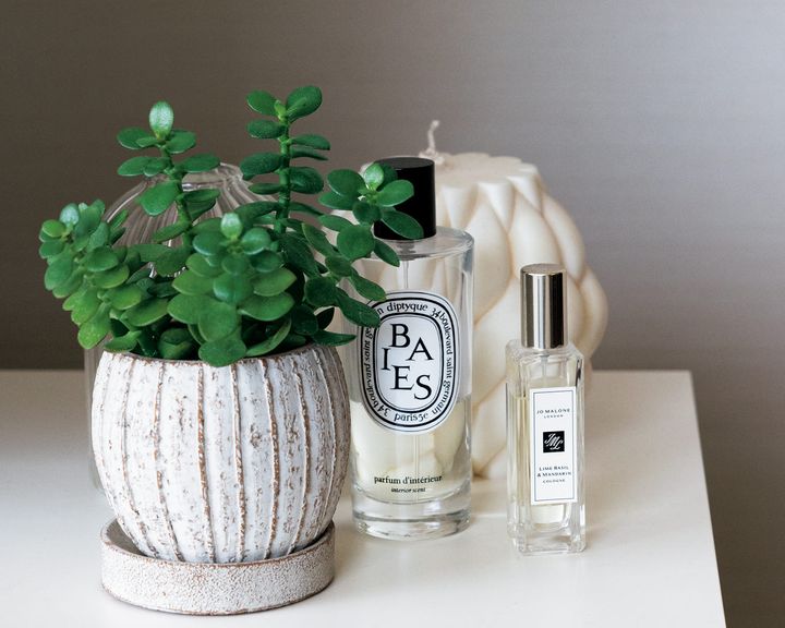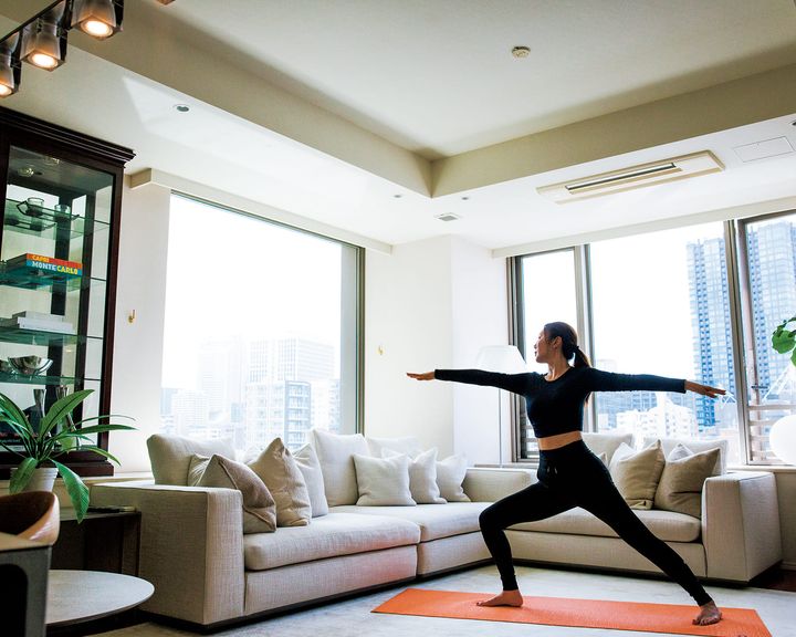 ヨガは週2で8年ほど続け、人一倍硬かっ た体も前屈で床に手がつくほど柔軟に。ジムでパーソナルトレーニングも週3で並行して行い、体脂肪率-5%に。何歳からでも体は変わると実感中。リビングはディプティックのルームフレグランスで気持ちもUP。