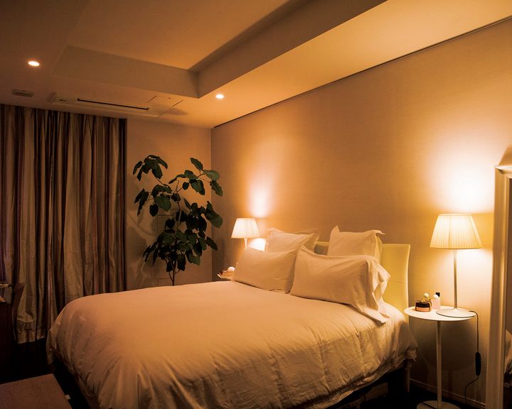 寝室は明かりを落とし、キリアンやゲランなどのお気に入りの香りを気分で選んで纏い、心地よい音楽を流し自律神経を整えます。寝具はホテルで寝心地が良かったシモンズのマットレスや枕を愛用。真っ白なシーツやカバーで清潔感&ホテル仕様に。湿度は50%がベスト。加湿器で調整しています。就寝前に入浴し、一日の疲れを癒した後、最近お気に入りのザ・ギンザの化粧水と乳液でたっぷり保湿。メークコスメは鏡台の引き出しに取り出しやすく収納しています。