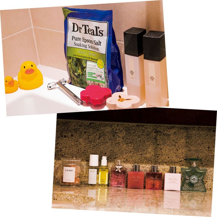 お風呂ではDr Teal’sのエプソムソルトや、KITOWAのバスエッセンスを入れてゆったりながら美容。YSLのゲルマニウム入りマッサージツールで顔や首を、ukaのケンザンで頭皮をマッサージして疲れを癒します。Miss Diorのボディミルクで全身くまなくしっとり。