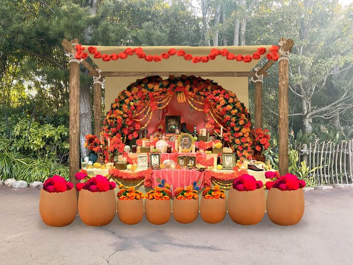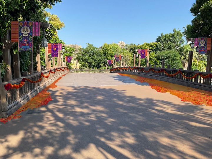魂を導く花とされるマリーゴールドの花々が美しく飾られ、『リメンバー・ミー』の世界の雰囲気を楽しめます。