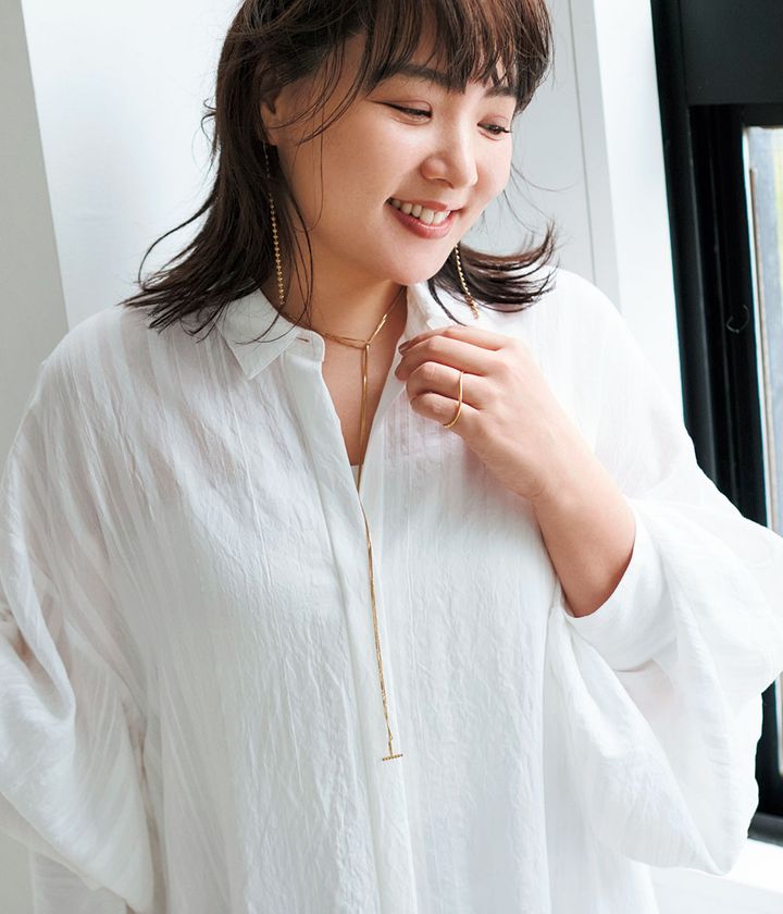 マシュマロ体型さんのハリのある胸元には、華奢でも存在感があるロングやひとクセパールを効かせて、品よく主張するのが◎。