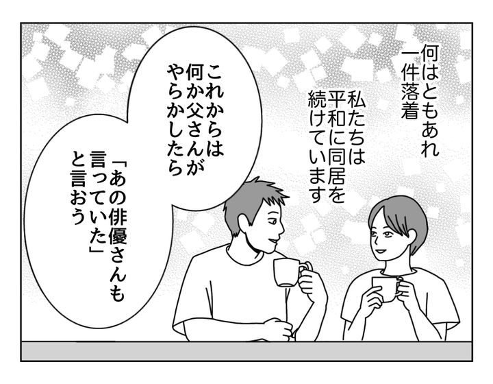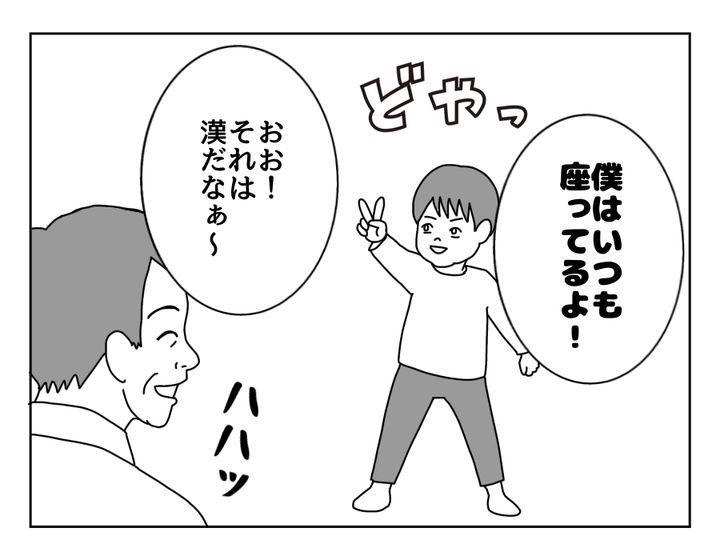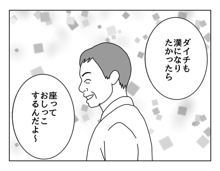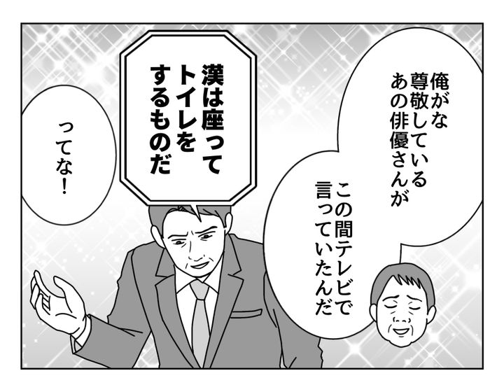 モモさん(33)は旦那のマモルさん(34)とお子さん2人、そして義両親と住んでいます。マモルさんは毎日お義父さんが立ったままおしっこをして、床などを汚すことに怒っています。ストレスにより、別居の意思が固まりつつあるモモさん夫婦。いつ義両親に報告するか悩んでいるうちに2週間ほどが過ぎました。すると「最近お父さんがトイレを汚さない」とお義母さんから報告が……。また庭でしているのではないかと疑いますが、ちょうど、お義父さんが2階のトイレに入っています。ダイチくんがドアを開けるとそこには座っておしっこをするお義父さんの姿がありました。なんと「尊敬する俳優さんが座ってする派だったから」という理由で、すんなりと座ってするようになっていたのです。今までの抵抗はなんだったのでしょうか。