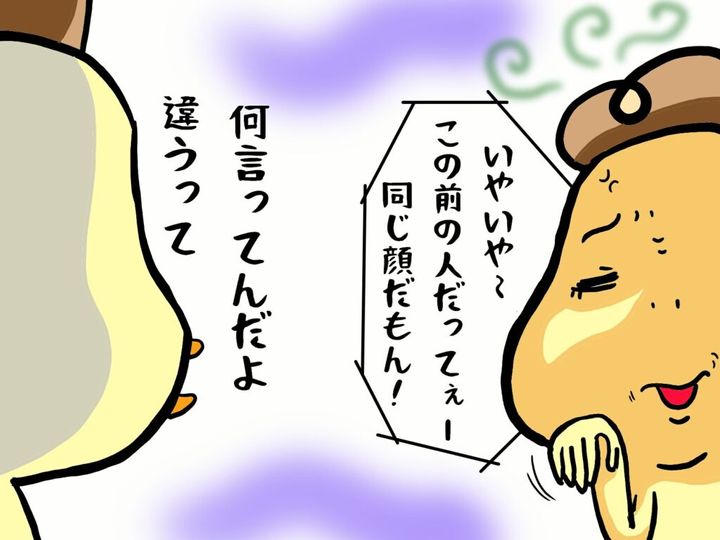 「いやいや~。この前の人だってぇー。同じ顔だもん!」と再度強く主張するも、「何言ってんだよ。違うって」とまたまた否定され、