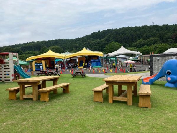 私が訪れたのは開園直後でしたが、すでに広い駐車場にはたくさんの車が。遊園地にも大勢の子供やファミリーがいました。黄色い屋根の中央にあるスライダーが人気とのお話です。
