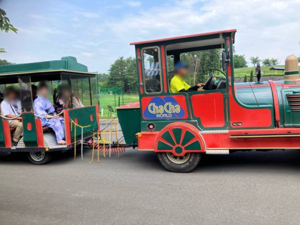 こちらは電車型の車「チューチュートレイン」。遊園地前から出発して、あじさい園方面に向かっていきました。