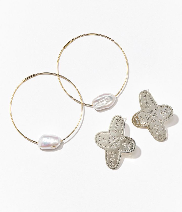 〈上〉大きめフープで小顔効果も期待できる。ピアス(着用と同じ)¥16,000(バナナ・リパブリック)