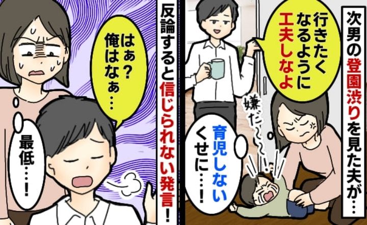 ある日の朝、いつものように玄関先で行き渋る次男をなだめる私。するとその様子を見ていた夫が「まだ行き渋りしているんだ? 家を出る前に幼稚園へ行く気持ちが高まるように、ママが工夫したらいいじゃん」「外で頑張るんだから、家にいるときにもう少し甘えさせたほうがいいんじゃない?」と、コーヒーを片手にドヤ顔でアドバイスしてきました。