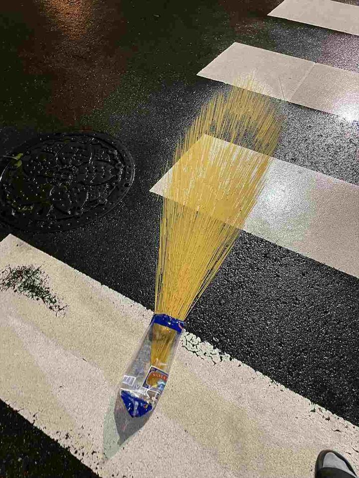 濡れたアスファルトの上に豪快に落ちたパスタが、まるでホウキのような形状になっています!
